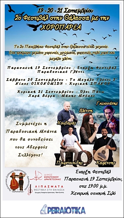 Ο Πολιτιστικός Σύλλογος Κερατσινίου-Δραπετσώνας «Η Χοροπαρέα» διοργανώνει για δεύτερη χρονιά το Πανελλήνιο Φεστιβάλ Παράδοσης, ένα τριήμερο αφιερωμένο στους παραδοσιακούς χορούς και τραγούδια από όλη την Ελλάδα.