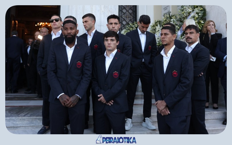 Πλήθος κόσμου, εκπρόσωποι της πολιτικής ηγεσίας, του επιχειρηματικού κόσμου, Πρόεδροι ομάδων, η ΠΑΕ Ολυμπιακός και όλοι οι Ποδοσφαιριστές της πρώτης ομάδας, Βετεράνοι ποδοσφαιριστές, Δημοσιογράφοι,