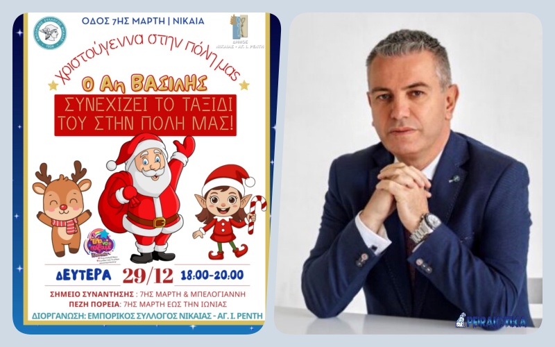 Ο Δήμος Νίκαιας – Αγ. Ι. Ρέντη ολοκληρώνει το φετινό πρόγραμμα χριστουγεννιάτικων εκδηλώσεων που διοργάνωσε σε συνεργασία με τον Εμπορικό Σύλλογο της πόλης, με μια σειρά εορταστικών δράσεων από τη Δευτέρα 29 έως την Τετάρτη 31 Δεκεμβρίου 2025.