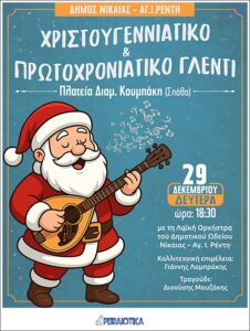 Οι εκδηλώσεις συνεχίζουν τη γιορτινή ατμόσφαιρα στην πόλη, με το ταξίδι του Άη Βασίλη και των βοηθών του με δώρα και εκπλήξεις για τα παιδιά. Στην πλατεία Διαμάντως Κουμπάκη τη Δευτέρα 29 Δεκεμβρίου και ώρα 18.30 θα πραγματοποιηθεί το Πρωτοχρονιάτικο γλέντι της Λαϊκής Ορχήστρας του Δημοτικού Ωδείου Νίκαιας – Αγ. Ι. Ρέντη.