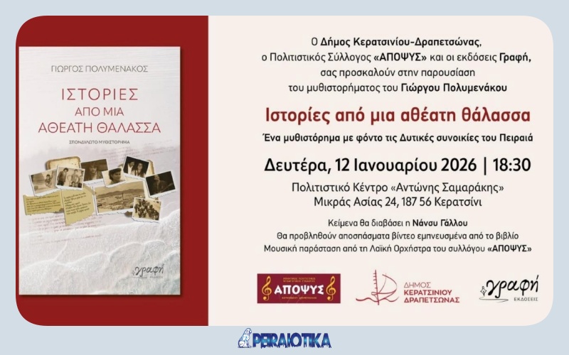 Ο Δήμος Κερατσινίου-Δραπετσώνας, ο Πολιτιστικός Σύλλογος ΑΠΟΨΥΣ και οι εκδόσεις Γραφή σας προσκαλούν σε μια μοναδική πολιτιστική εμπειρία που συνδυάζει λογοτεχνία, εικόνα και μουσική.