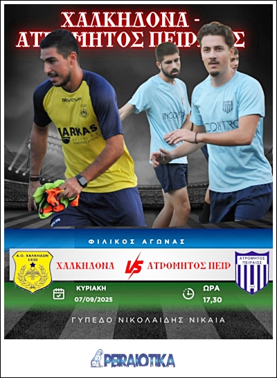 Σπουδαίο φιλικό παιχνίδι θα διεξαχθεί σήμερα, Κυριακή 7 Σεπτεμβρίου, στο γήπεδο Νικολαΐδης στη Νίκαια ανάμεσα σε δύο ιστορικά σωματεία του Πειραιά: τη Χαλκηδόνα και τον Ατρόμητο Πειραιά.