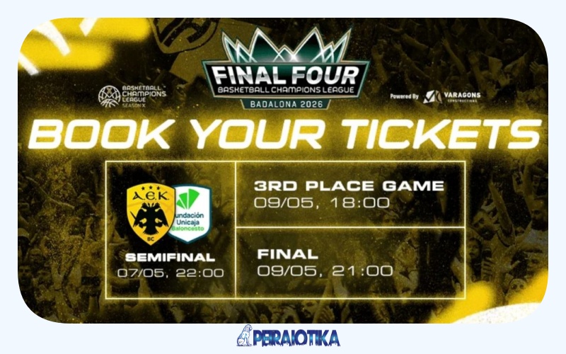 Η ΚΑΕ ΑΕΚ ανακοίνωσε την έναρξη της ηλεκτρονικής διάθεσης των εισιτηρίων για το Final Four του Basketball Champions League της σεζόν 2025-2026, το οποίο θα φιλοξενηθεί στο Palau Municipal d’Esports de Badalona, στην καρδιά της Καταλονίας.