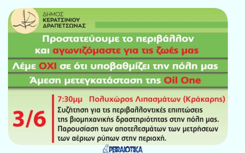 Ο Δήμος Κερατσινίου-Δραπετσώνας καλεί τους κατοίκους σε μια ανοιχτή εκδήλωση ενημέρωσης και διαλόγου, με κεντρικό θέμα τα αποτελέσματα των μετρήσεων αέριων ρύπων και τις σοβαρές περιβαλλοντικές συνέπειες από τη λειτουργία βιομηχανικών εγκαταστάσεων στην περιοχή, όπως η Oil-One.