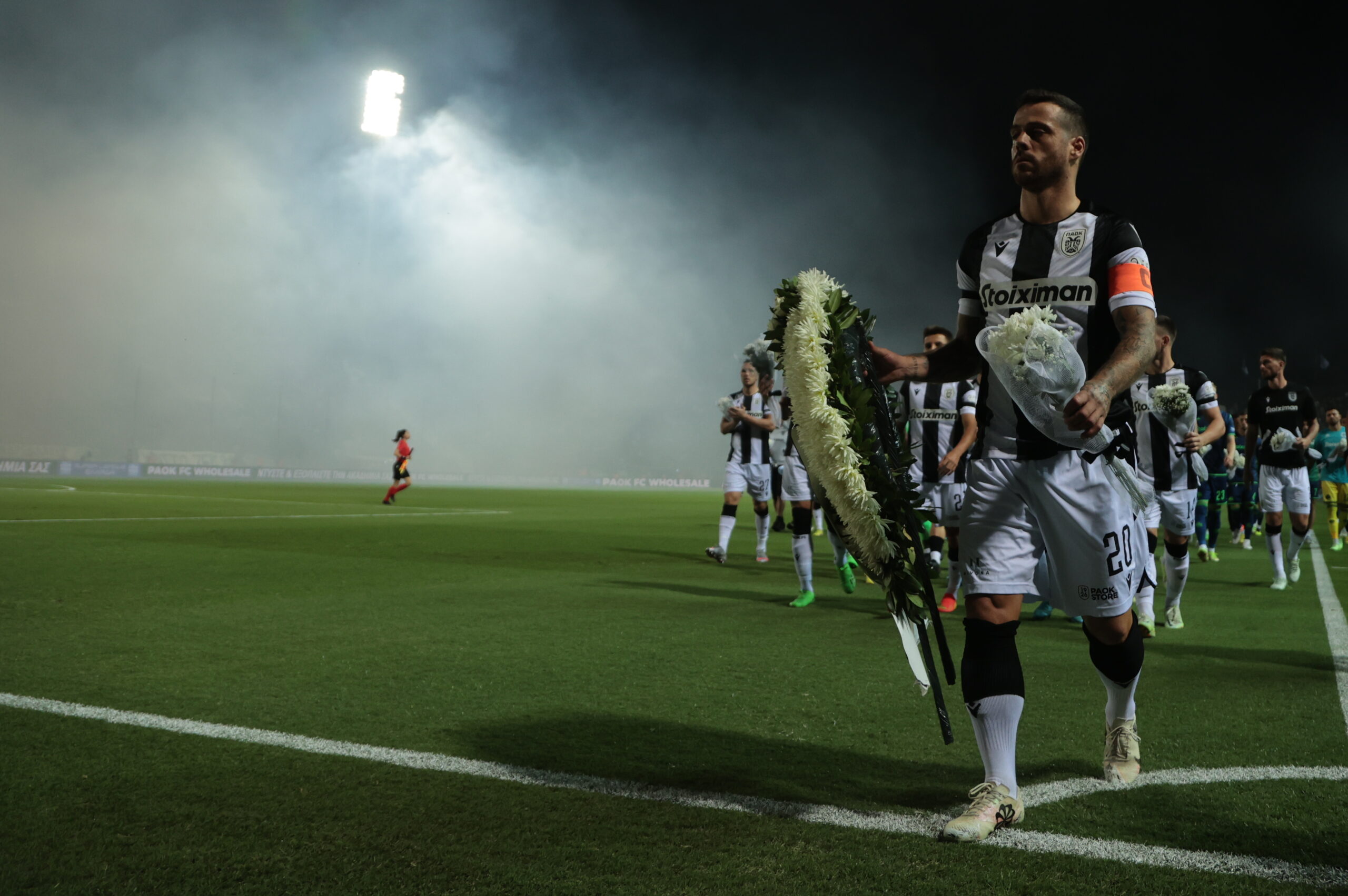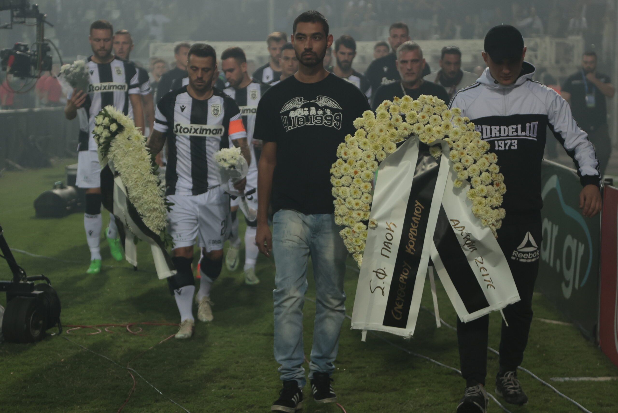 Συγκινητικές στιγμές επιφύλασσε το ντέρμπι μεταξύ ΠΑΟΚ και Παναθηναϊκό, λίγο πριν την έναρξη, καθώς οι δύο ομάδες κατέθεσαν στεφάνια μπροστά από τη Θύρα 4, εις μνήμην των αδικοχαμένων φιλάθλων του “δικεφάλου του βορρά” στα Τέμπη (4/10/1999).