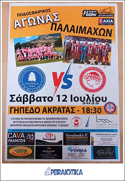 Ο Σύνδεσμος Βετεράνων Ποδοσφαιριστών Ολυμπιακού Πειραιώς ετοιμάζεται να δώσει το 702ο του παιχνίδι το Σάββατο 12 Ιουλίου στις 18:30, αυτή τη φορά στην παραλιακή και φιλόξενη Αιγείρα, λίγο πριν το Αίγιο και μόλις 147 χλμ από την Αθήνα.