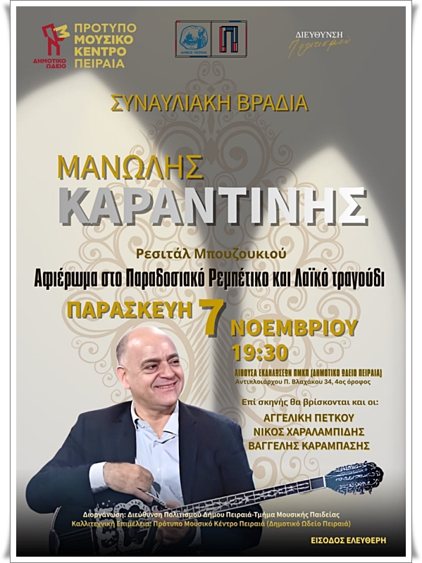 Το Πρότυπο Μουσικό Κέντρο Πειραιά – Δημοτικό Ωδείο, αύριο Παρασκευή 7.11.2025, και ώρα 19.30, έχει την χαρά και την τιμή να φιλοξενεί έναν ακόμη καταξιωμένο καλλιτέχνη και κορυφαίο σολίστ του μπουζουκιού τον Μανώλη Καραντίνη ο οποίος θα δώσει ένα καταπληκτικό ρεσιτάλ.