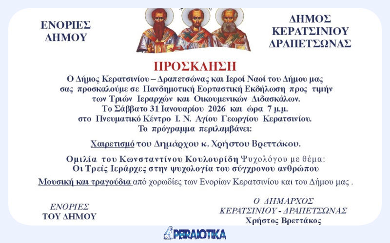 Ο Δήμος Κερατσινίου – Δραπετσώνας και οι Ιεροί Ναοί του Δήμου μας, σας προσκαλούμε σε Πανδημοτική Εορταστική Εκδήλωση προς τιμή των Τριών Ιεραρχών και Οικουμενικών Διδασκάλων.