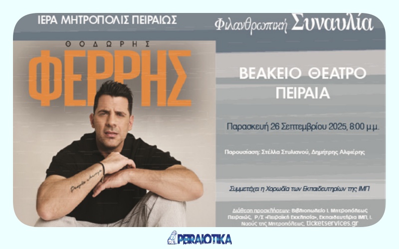 Σε μια ξεχωριστή φιλανθρωπική συναυλία, με στόχο την ενίσχυση του κοινωνικού και προνοιακού έργου της Μητροπόλεώς μας, ο αγαπημένος ερμηνευτής Θοδωρής Φέρρης θα χαρίσει στο κοινό του Πειραιά ένα μουσικό ταξίδι γεμάτο συναίσθημα και γνωστά τραγούδια που αγαπήθηκαν από μικρούς και μεγάλους.