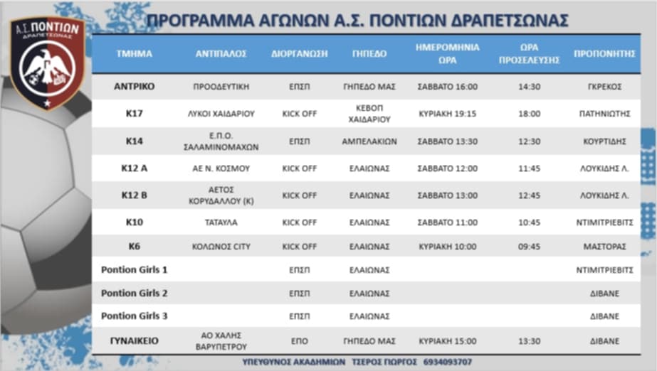 Δείτε αναλυτικά το πρόγραμμα της ακαδημίας του ΑΣ.Ποντίων στον πίνακα που ακολουθεί για την αγωνιστική 15-16/3/2025..