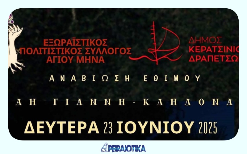 Ο Εξωραϊστικός Πολιτιστικός Σύλλογος Αγίου Μηνά Κερατσινίου, σε συνεργασία με τον Δήμο Κερατσινίου – Δραπετσώνας, σας προσκαλεί σε μια ξεχωριστή πολιτιστική εμπειρία: την 10η ετήσια Αναβίωση του Εθίμου του Αη Γιάννη του Κλήδονα.