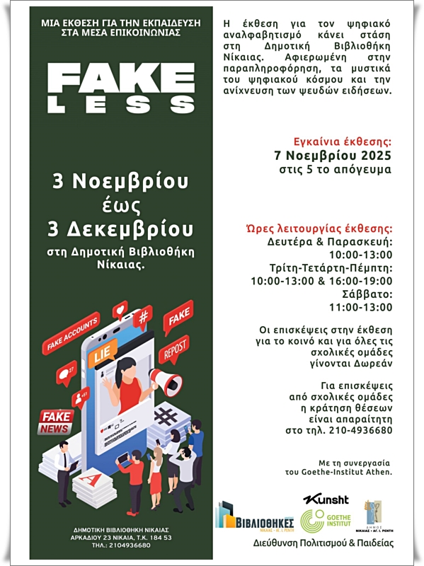 Η έκθεση «FAKELESS — Μαθαίνω να αναγνωρίζω την αλήθεια» προσκαλεί όλους τους πολίτες να ανακαλύψουν πώς να διακρίνουν την αληθινή πληροφορία από την παραπληροφόρηση και να αποκτήσουν εργαλεία για να κρίνουν με ασφάλεια όσα διαβάζουν και βλέπουν καθημερινά.