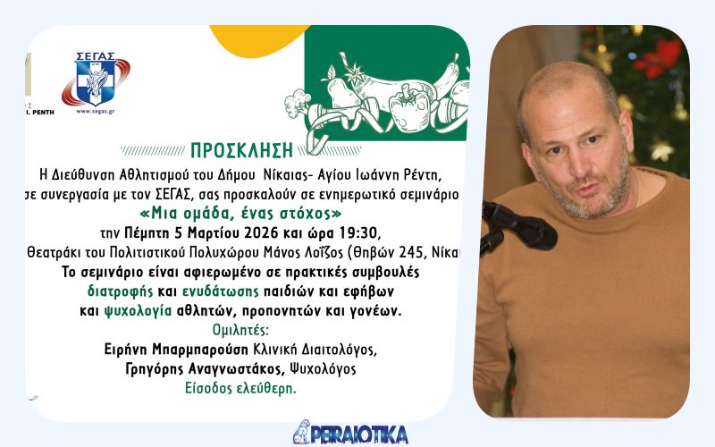 Ένα ενημερωτικό σεμινάριο με επίκεντρο τη σωστή διατροφή, την ενυδάτωση και την ψυχολογική υποστήριξη στον αθλητισμό διοργανώνεται στη Νίκαια, με στόχο την ενίσχυση της συνεργασίας μεταξύ αθλητών, προπονητών και γονέων.
