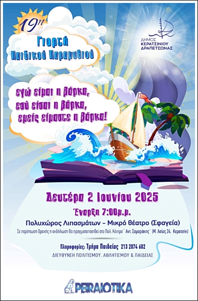 Για 19η χρονιά, ο Δήμος Κερατσινίου – Δραπετσώνας συνεχίζει να επενδύει στη φαντασία, την παιδεία και τη συναισθηματική ανάπτυξη των παιδιών, μέσα από έναν αγαπημένο πλέον θεσμό: τη Γιορτή του Παιδικού Παραμυθιού.