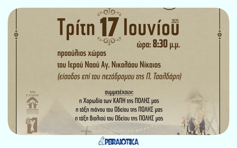 Η εκδήλωση θα πραγματοποιηθεί την Τρίτη 17 Ιουνίου και ώρα 8:30 μ.μ., στον προαύλιο χώρο του Ιερού Ναού Αγίου Νικολάου Νίκαιας (είσοδος από τον πεζόδρομο της Π. Τσαλδάρη).