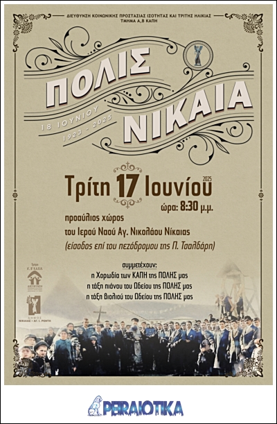 Η επετειακή εκδήλωση «ΠΟΛΙΣ ΝΙΚΑΙΑ – 18 Ιουνίου 1923–2025», που διοργανώνει η Διεύθυνση Κοινωνικής Προστασίας του Δήμου Νίκαιας-Αγ. Ι. Ρέντη, υπόσχεται να αποτελέσει μια γιορτή μνήμης και διαγενεακής πολιτιστικής συμμετοχής.