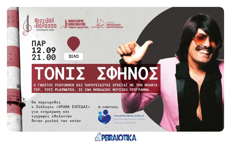 Ο Δήμος Κερατσινίου – Δραπετσώνας διοργανώνει το Φεστιβάλ στη Θάλασσα με μία μοναδική μουσική βραδιά, featuring τον γνωστό performer Τόνι Σφήνο και τη μπάντα του.