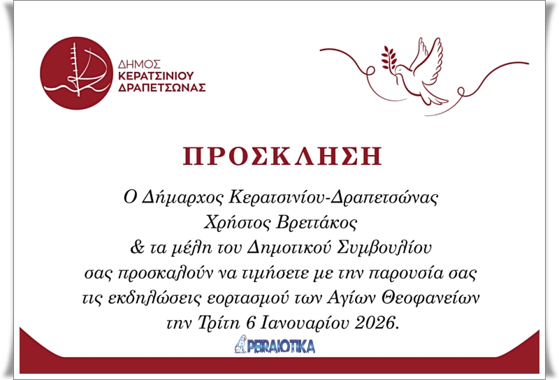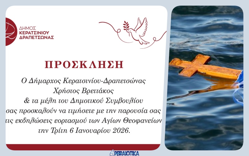 Ο Δήμαρχος Κερατσινίου – Δραπετσώνας, κ. Χρήστος Βρεττάκος, και τα μέλη του Δημοτικού Συμβουλίου σας προσκαλούν να τιμήσετε με την παρουσία σας τις επίσημες εκδηλώσεις για τον εορτασμό των Αγίων Θεοφανείων, την Τρίτη 6 Ιανουαρίου 2026.