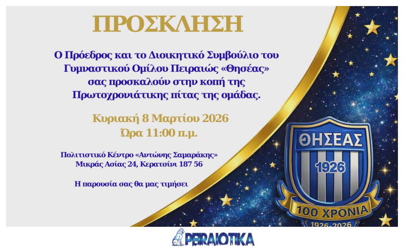 Την Κυριακή 8 Μαρτίου 2026 και ώρα 11:00 π.μ., στο Πολιτιστικό Κέντρο «Αντώνης Σαμαράκης» στο Κερατσίνι, η οικογένεια του Θησέα θα συναντηθεί για να γιορτάσει τη νέα χρονιά, αλλά και ένα σπουδαίο ορόσημο: τα 100 χρόνια ιστορίας (1926–2026) του συλλόγου.