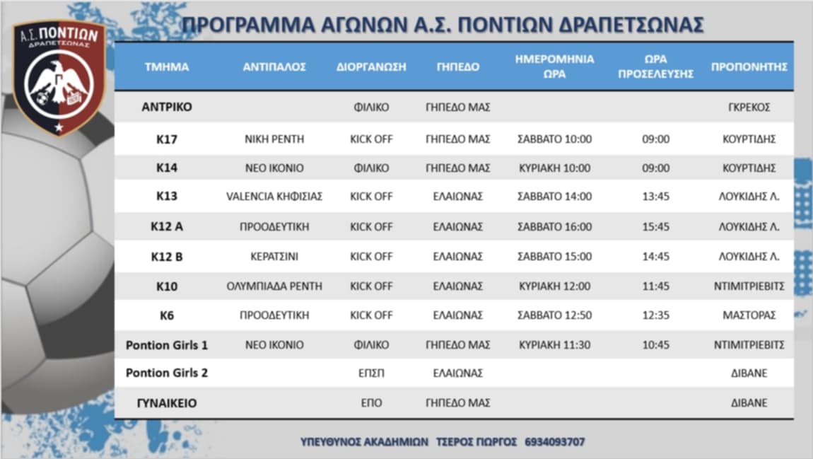 Η ακαδημία του ΑΣ.Ποντίων ολοκλήρωσε μια εβδομάδα γεμάτη έντονες και αποδοτικές προπονήσεις, όπου οι νεαροί ποδοσφαιριστές δούλεψαν σκληρά για να βελτιώσουν τις δεξιότητές τους, το ομαδικό πνεύμα και την τακτική τους. Οι προπονητές μας ήταν παρόντες σε κάθε βήμα, ενθαρρύνοντας και υποστηρίζοντας τους αθλητές να φτάσουν το μέγιστο των δυνατοτήτων τους.
