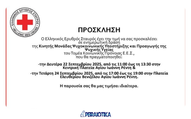 Η Κινητή Μονάδα Ψυχοκοινωνικής Υποστήριξης και Προαγωγής της Ψυχικής Υγείας του Ε.Ε.Σ., στο πλαίσιο προγραμμάτων για την προαγωγή της ψυχικής υγείας, θα πραγματοποιήσει ενημερωτική δράση στον Δήμο Νίκαιας – Αγ. Ι. Ρέντη, και συγκεκριμένα: