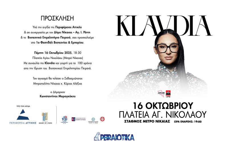 Ο Δήμος Νίκαιας – Αγίου Ιωάννη Ρέντη, με την αιγίδα της Περιφέρειας Αττικής και σε συνεργασία με το Βιοτεχνικό Επιμελητήριο Πειραιά, διοργανώνει το 1ο Φεστιβάλ Βιοτεχνίας και Εμπορίου, την Πέμπτη 16 Οκτωβρίου στις 18:30, στην Πλατεία Αγίου Νικολάου (Μετρό Νίκαιας).