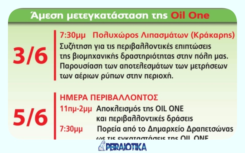 Ο Δήμος Κερατσινίου – Δραπετσώνας, σε συνεργασία με φορείς και συλλογικότητες της πόλης, απευθύνει κάλεσμα συμμετοχής σε σειρά δράσεων και κινητοποιήσεων με στόχο την άμεση μετεγκατάσταση της Oil-One και την απομάκρυνση όλων των ρυπογόνων βιομηχανικών δραστηριοτήτων από την παραλιακή ζώνη της Δραπετσώνας.