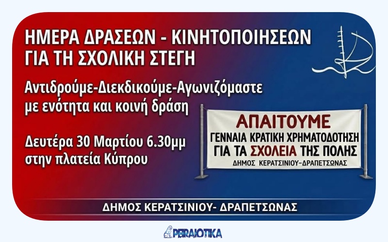 Σε μια περίοδο έντονων πιέσεων για τη σχολική στέγη και τις υποδομές εκπαίδευσης, φορείς γονέων και κηδεμόνων στον Κερατσίνι–Δραπετσώνα απευθύνουν κάλεσμα μαζικής συμμετοχής σε κινητοποίηση που διοργανώνει ο Δήμος τη Δευτέρα 30 Μαρτίου στην Πλατεία Κύπρου.