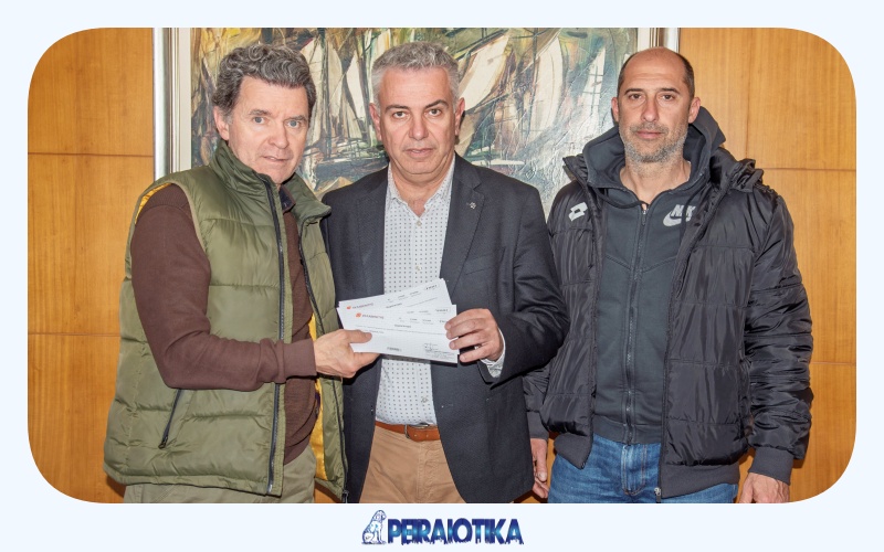 Ο Αναπληρωτής Πρόεδρος Δημήτρης Καλύκας και ο Γενικός Γραμματέας Κώστας Λαζάρου παρέδωσαν τις δωροεπιταγές στον Δήμαρχο Νίκαιας-Αγίου Ιωάννη Ρέντη, Κωνσταντίνο Μαραγκάκη.
