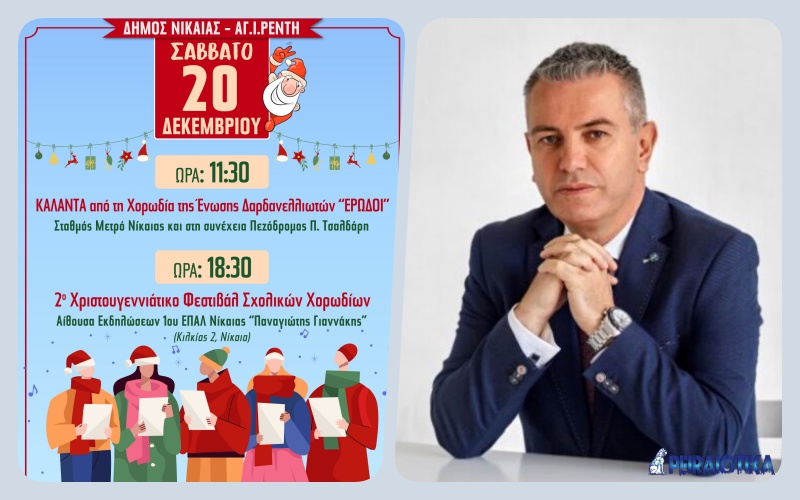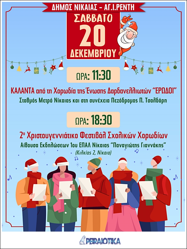 Ο σταθμός Μετρό Νίκαιας θα πλημμυρίσει με γιορτινές μελωδίες το Σάββατο 20 Δεκεμβρίου, στις 11:30 π.μ., χάρη στη Χορωδία Δαρδανελιωτών «Ερωδοί», που θα παρουσιάσει παραδοσιακά χριστουγεννιάτικα κάλαντα. Η εορταστική ατμόσφαιρα θα συνεχιστεί στον πεζόδρομο της οδού Π. Τσαλδάρη, μετατρέποντας την καρδιά της πόλης σε έναν ζωντανό χώρο μουσικής και χαράς.