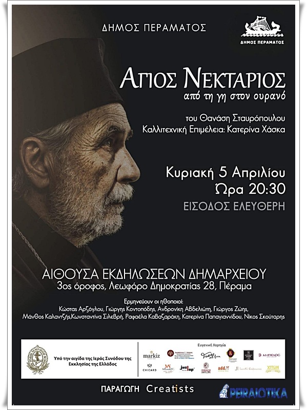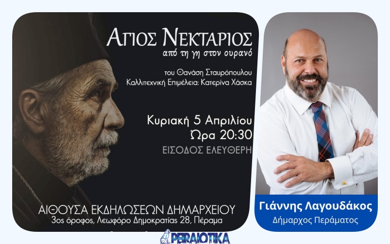 Την θεατρική παράσταση «Άγιος Νεκτάριος, από τη γη στον ουρανό» φέρνει δωρεάν για το λαό του Περάματος η δημοτική αρχή του Γιάννη Λαγουδάκου, στο πλαίσιο της κατάνυξης των ημερών του φετινού Πάσχα. Πρόκειται για το έργο του Θανάση Σταυρόπουλου σε σκηνοθεσία του βραβευμένου Μενέλαου Τζαβέλλα, που περιοδεύει εδώ και ένα χρόνο με μεγάλη επιτυχία, εμπνέοντας βαθιά συγκίνηση στο κοινό στην Ελλάδα και στο εξωτερικό.