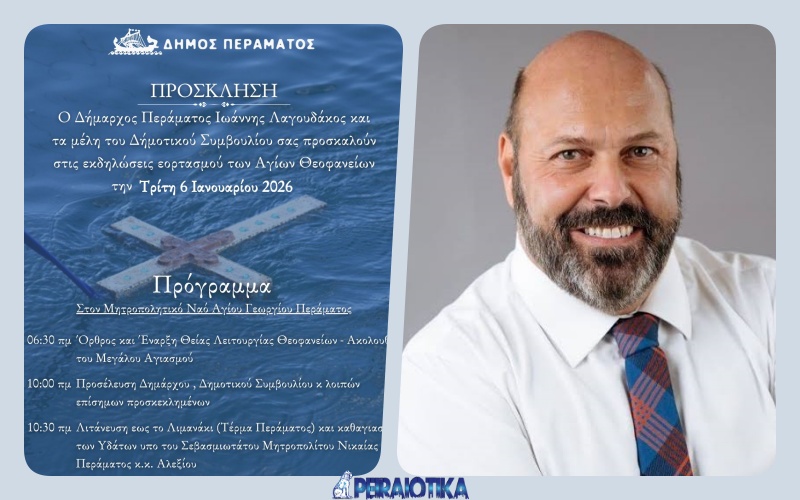 Ο Δήμαρχος Περάματος κ. Γιάννης Λαγουδάκος προσκαλεί τους πολίτες της πόλης, καθώς και τα μέλη της Διοίκησης και του Δημοτικού Συμβουλίου, να τιμήσουν με την παρουσία τους τις εορταστικές εκδηλώσεις των Αγίων Θεοφανείων, την Τρίτη 6 Ιανουαρίου 2026.