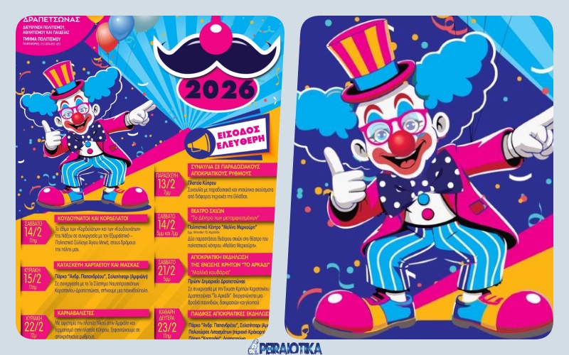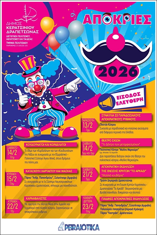 Στο πλαίσιο της διαρκούς επαφής των κατοίκων με τα ήθη και τις παραδόσεις του τόπου μας, ο Δήμος Κερατσινίου-Δραπετσώνας διοργανώνει και φέτος ένα πολυήμερο πρόγραμμα αποκριάτικων εκδηλώσεων, με στόχο να προσφέρει στιγμές ψυχαγωγίας, δημιουργίας και συμμετοχής για μικρούς και μεγάλους.