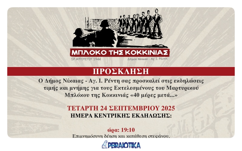 Ο Δήμος Νίκαιας – Αγ. Ι. Ρέντη διοργανώνει εκδηλώσεις μνήμης και τιμής από τις 19 Σεπτεμβρίου έως τις 3 Οκτωβρίου 2025 στη Μάντρα Μπλόκου Κοκκινιάς (Ηλιουπόλεως 102Α, Νίκαια) και σε κεντρικά σημεία της πόλης. Πρόκειται για ένα πολυδιάστατο πρόγραμμα με συναυλίες, θεατρικές παραστάσεις, ποιητικές βραδιές και την κεντρική τελετή μνήμης, με στόχο τη διατήρηση της ιστορικής μνήμης και την απόδοση φόρου τιμής στους εκτελεσμένους του Μπλόκου.