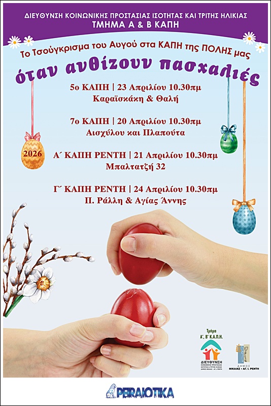Με αφορμή την εαρινή περίοδο και την προσμονή των ημερών του Πάσχα, η Διεύθυνση Κοινωνικής Προστασίας, Ισότητας και Τρίτης Ηλικίας του Δήμου Νίκαιας – Αγίου Ιωάννη Ρέντη, μέσω των Τμημάτων Α’ & Β’ ΚΑΠΗ, υλοποιεί έναν κύκλο εορταστικών και κοινωνικών εκδηλώσεων με τίτλο «Όταν ανθίζουν οι πασχαλιές».