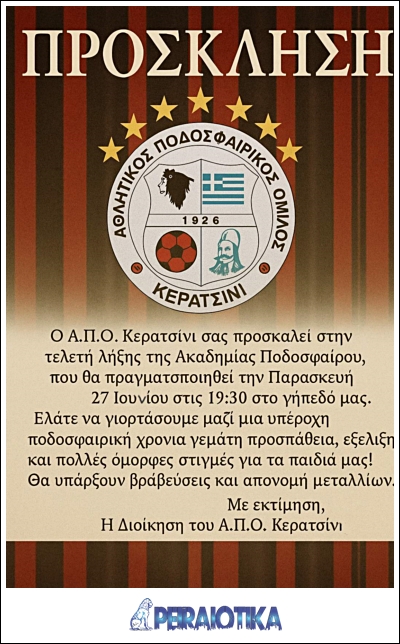 Με ιδιαίτερη χαρά και τιμή, η Ακαδημία ΑΠΟ Κερατσίνι ανακοινώνει ότι στην τελετή λήξης της, η οποία θα πραγματοποιηθεί αυτή την Παρασκευή στις 19:30, θα δώσει το “παρών” ο εμβληματικός Λουτσιάνο Ντε Σόουζα.