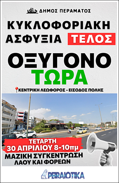 Σε μία δυναμική και αποφασιστική κινητοποίηση προχωρά η πόλη του Περάματος την Τετάρτη 30 Απριλίου, υλοποιώντας ομόφωνη απόφαση του Δημοτικού Συμβουλίου και όλων των δημοτικών παρατάξεων, με αίτημα την άμεση αντιμετώπιση της ασφυκτικής κυκλοφοριακής κατάστασης που εδώ και χρόνια ταλανίζει την περιοχή.
