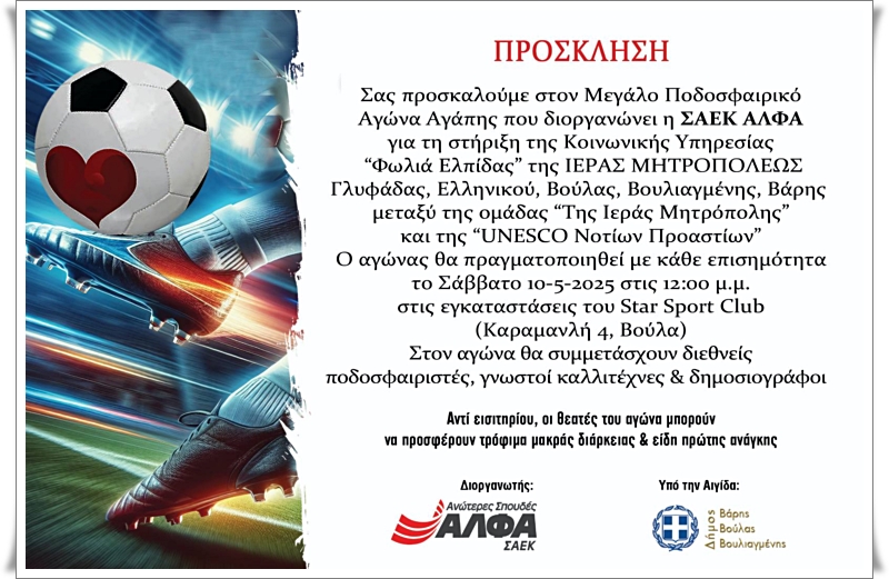 Η ΣΑΕΚ ΑΛΦΑ με ιδιαίτερη χαρά και αίσθημα κοινωνικής ευθύνης ανακοινώνει τη διοργάνωση ενός ξεχωριστού ποδοσφαιρικού αγώνα αγάπης, με στόχο τη στήριξη του σπουδαίου έργου της Κοινωνικής Υπηρεσίας «Φωλιά Ελπίδας» της Ιεράς Μητρόπολης Γλυφάδας, Ελληνικού, Βούλας, Βουλιαγμένης και Βάρης. Ένας αγώνας με κοινωνικό αποτύπωμα και μήνυμα αλληλεγγύης, που φέρνει κοντά την Εκκλησία, τον πολιτισμό, τον αθλητισμό και την κοινωνία.