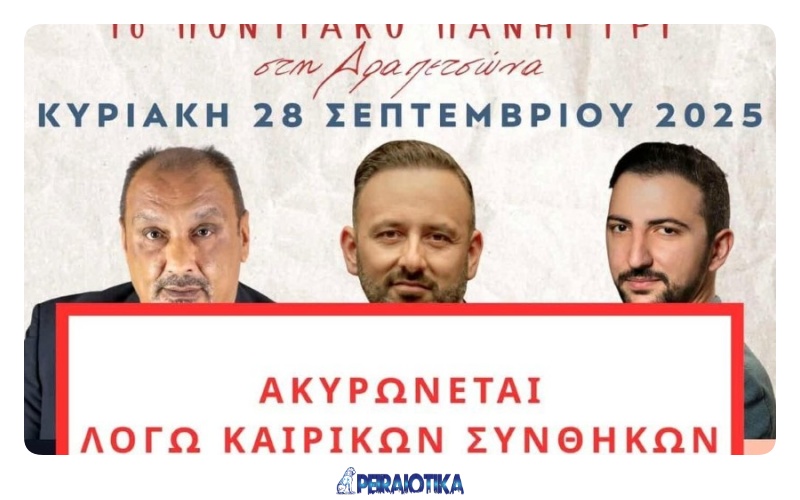 Η Ένωση Ποντίων Πειραιά – Κερατσινίου – Δραπετσώνας ενημερώνει τους φίλους και συνεργάτες της ότι η προγραμματισμένη εκδήλωση της Κυριακής στον Πολυχώρο των Λιπασμάτων δεν θα πραγματοποιηθεί, λόγω απρόβλεπτων καιρικών συνθηκών.