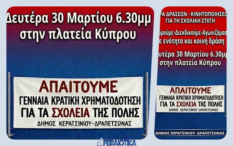 Με αφορμή τα σοβαρά προβλήματα στα σχολικά κτίρια της πόλης, οι γονείς, οι εκπαιδευτικοί και οι φορείς της περιοχής οργανώνουν ημέρα δράσεων και κινητοποιήσεων στο Δήμο Κερατσινίου – Δραπετσώνας.